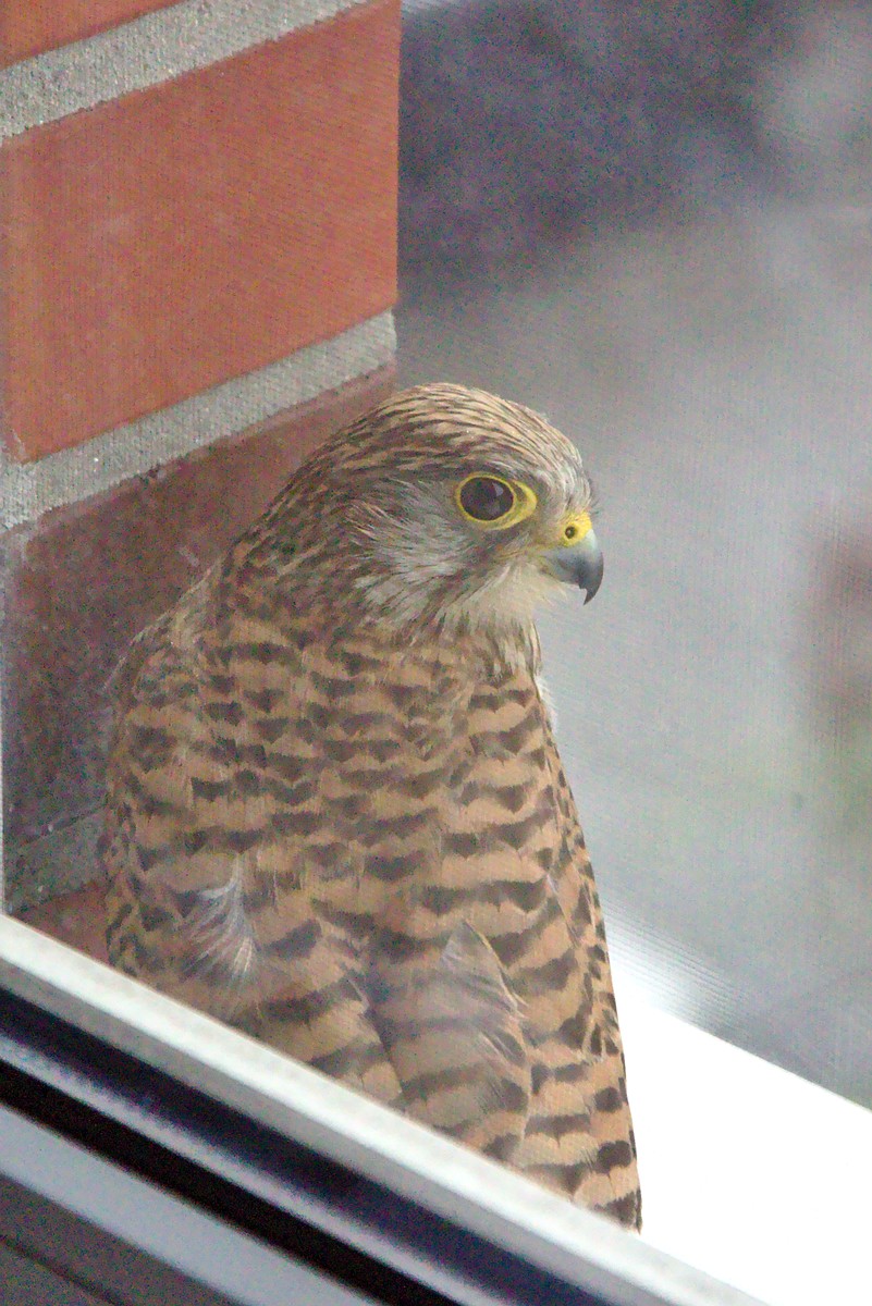 Gestern nachmittag suchte bei einem heftigen Unwetter ein Turmfalke Schutz bei uns auf der Fensterbank.